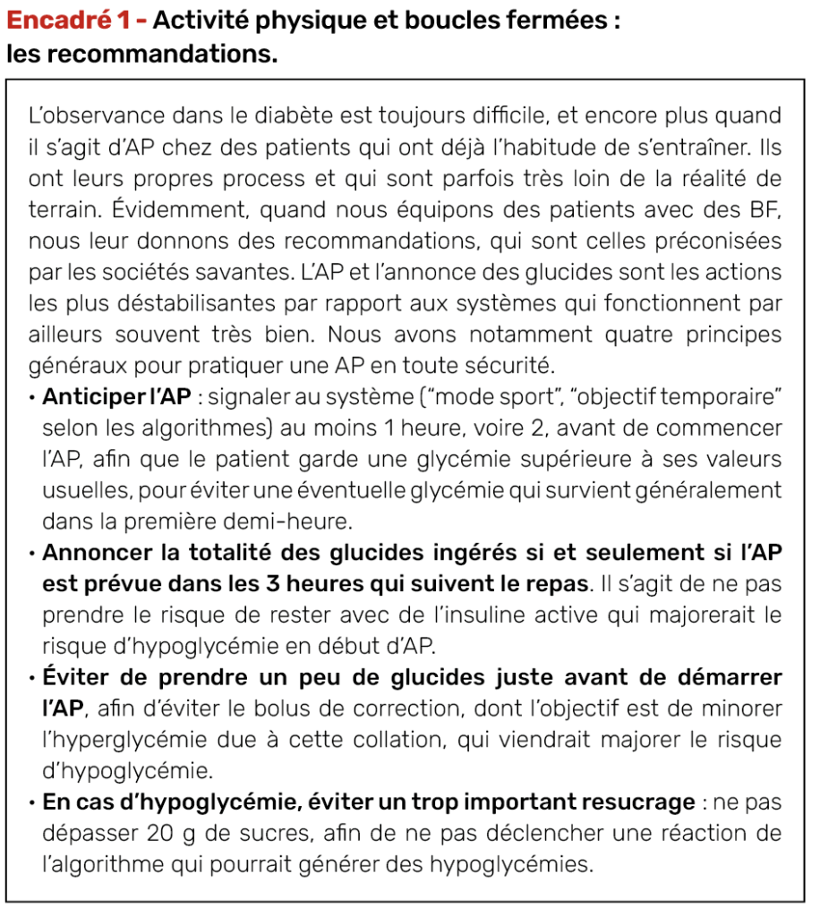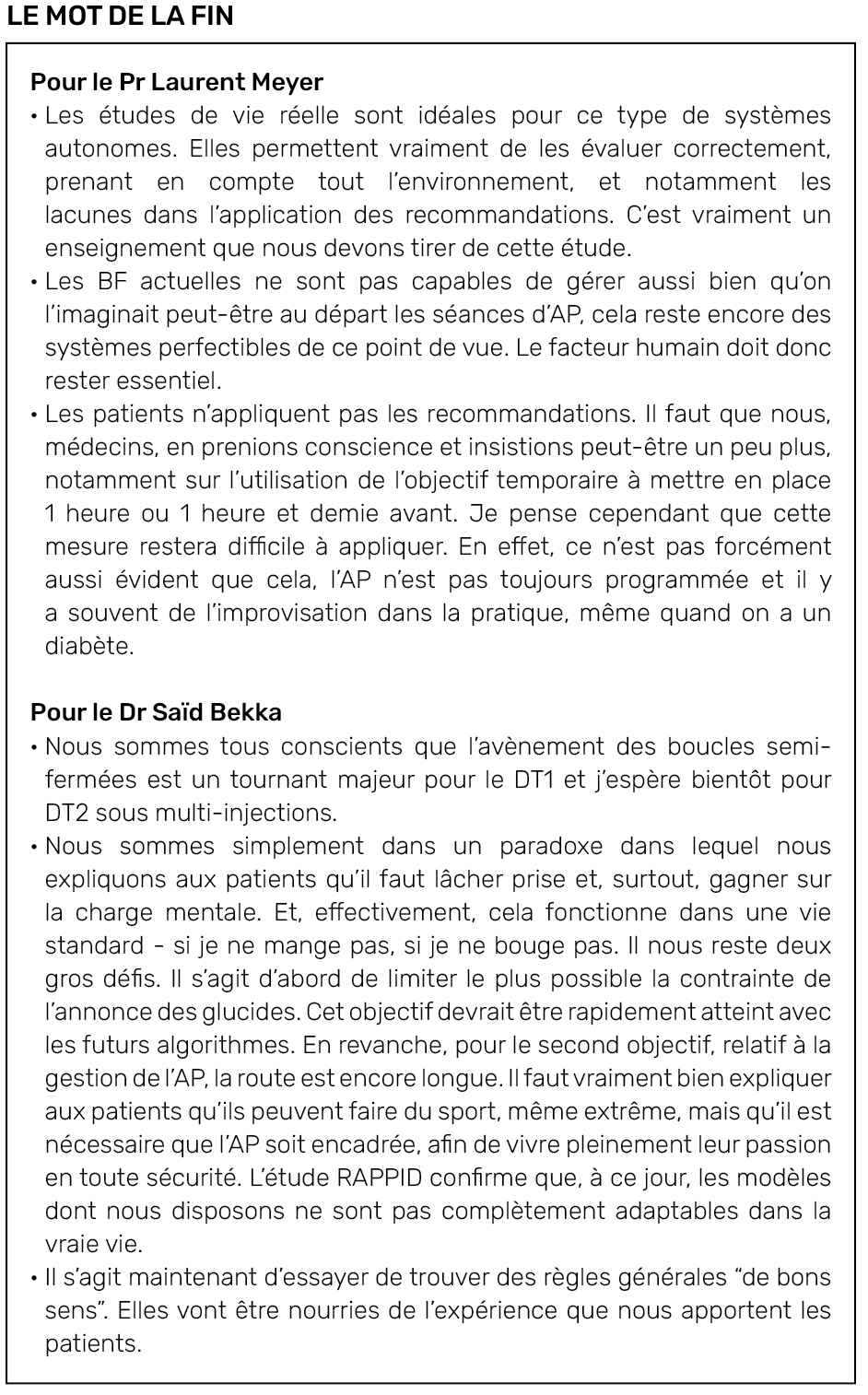 Nous avons constaté qu’aucun de nos quatre principes généraux (Encadré 1) ne sont vraiment suivis… Et que se passe-t-il ? C’est un enseignement majeur de l’étude RAPPID : que les patients ne suivent pas l’une ou l’autre de nos quatre recommandations ne change rien : il n’y a aucune différence en termes de fréquence d’hypoglycémies ou d’hyperglycémies. Cela ne signifie pas que ces recommandations sont inutiles, au contraire, mais qu’il faut savoir écouter le patient qui, lui, armé de son bon sens et de ses habitudes, a probablement un savoir-faire qui parfois nous surprend. Le patient a de l’antériorité, et il sait ce qui marche ou ne marche pas dans son cas. Il est indispensable, au-delà des recommandations générales essentielles, de toujours écouter le patient, qui se connaît, et d’introduire des nuances. Bien évidemment, nous parlons ici de patients aguerris qui font au moins deux séances d’AP par semaine depuis des années, dont certains ont un très bon niveau sportif.