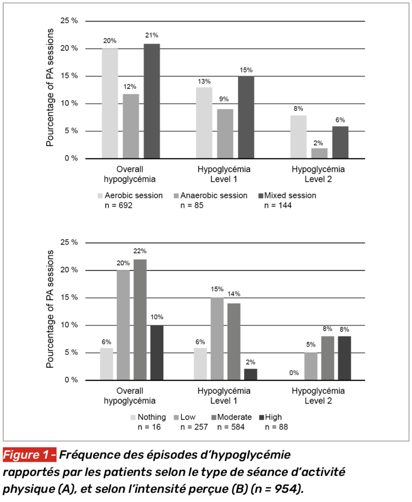 Lorsque l’on prend en compte la durée et l’intensité de l’activité, les résultats sont similaires : les hypoglycémies surviennent plus fréquemment lorsque l’intensité est légère à modérée et dans les deux premières heures de l’activité.