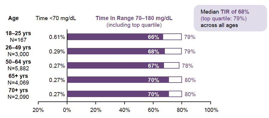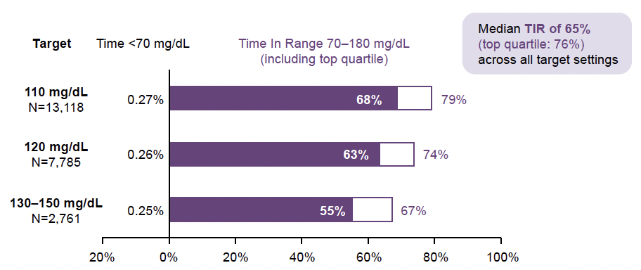 Les utilisateurs obtiennent un TIR élevé en utilisant le réglage cible le plus bas, avec très peu d’hypoglycémies. Le TIR médian est d’environ 80 % chez ceux ayant des réglages optimisés. La majorité des patients de cette étude utilise des méthodes simplifiées de bolus. Les résultats glycémiques sont excellents à tous les niveaux initiaux d’HbA1c, avec la plus grande amélioration estimée chez ceux ayant une HbA1c initiale plus élevée.