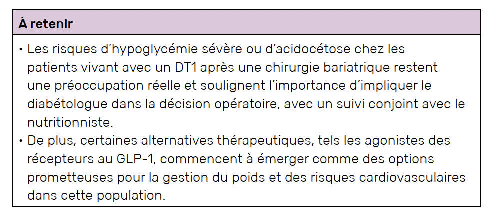 Malgré les résultats prometteurs en termes de réduction des besoins en insuline et des améliorations de certaines comorbidités, le contrôle glycémique après chirurgie bariatrique dans le DT1 reste variable et nécessite encore des investigations approfondies. Des études prospectives sont indispensables pour mieux comprendre les effets de la chirurgie bariatrique sur le DT1, évaluer les risques à long terme et identifier les patients qui pourraient bénéficier le plus de cette intervention.