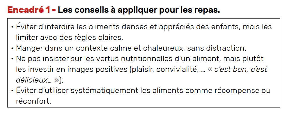 Les parents, particulièrement pendant la période de la néophobie alimentaire entre 2 et 8 ans, doivent augmenter la familiarité des nouveaux aliments. Il s’agit de montrer, impliquer l’enfant dans la préparation des repas. Les parents ne forcent pas l’enfant à manger, mais encouragent à goûter, par exemple en consommant eux-mêmes les aliments devant eux, avec plaisir. L’objectif est de renforcer les parents dans leur rôle ; cela signifie les soutenir sans jamais les juger, les aider très concrètement à établir les règles qui seront applicables chez eux (Encadré 1).