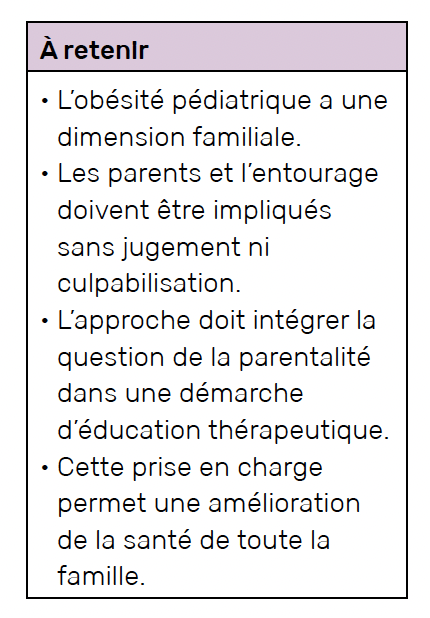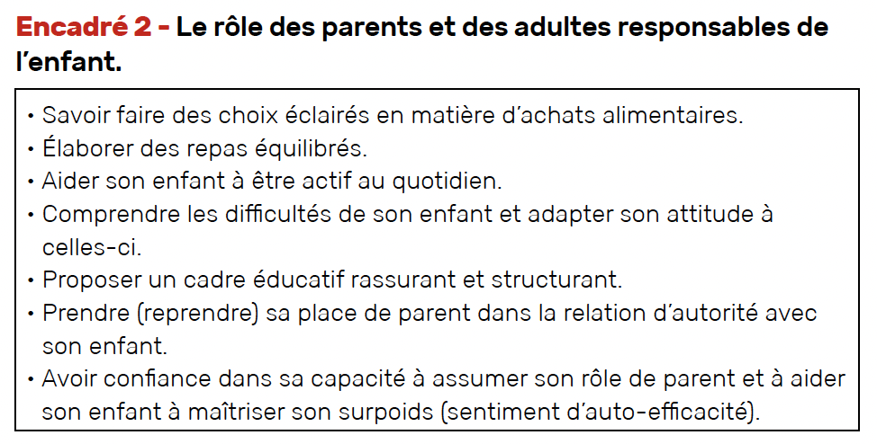 Il faut aider les parents à poser un cadre clair et cohérent et à envisager des efforts (sans privation) de toute la famille, enfant ou adolescent concerné par le surpoids ou l’obésité, fratrie, parents eux-mêmes.