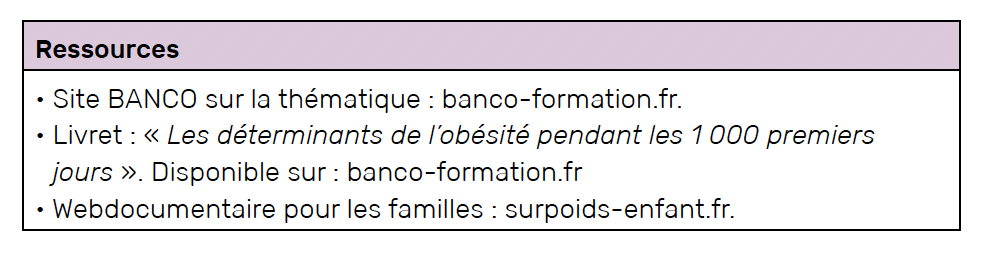 Le deuxième domaine liant famille et obésité de l’enfant concerne la période des 1 000 premiers jours de vie (7). Celle-ci, qui va de la conception de l’enfant à ses 2 ans, est une période d’opportunités, mais aussi de vulnérabilité et de nombreux facteurs intervenant pendant cette période ont montré un lien avec le risque d’excès de poids de l’enfant. Les mécanismes sont pluriels : marqueurs épigénétiques, effet sur le microbiote intestinal, effet direct de facteurs nutritionnels, facteurs éducatifs.
