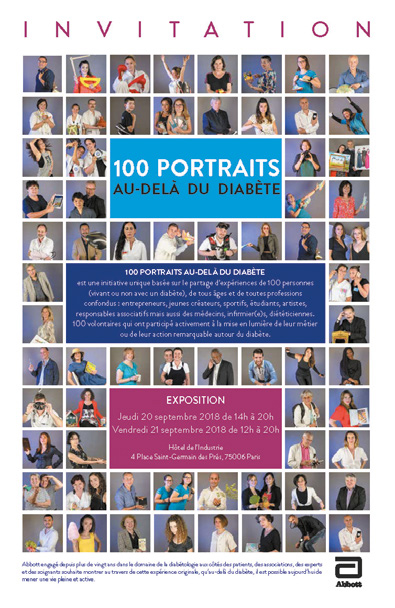 Ce projet a pour objectif de mettre en lumière des personnes vivant ou non avec un diabète, ayant accompli récemment une action originale au service du diabète et de sa prise en charge soit en montrant l’exemple dans son métier, son activité sportive ou artistique, soit en proposant un outil, une réalisation ou une activité originale au service des patients atteints de diabète. Pour ces portraits, les concepteurs ont sollicité des personnes de tous âges et professions : entrepreneurs, jeunes créateurs, sportifs, étudiants, artistes, responsables associatifs, soignants, chercheurs et experts, tous représentatifs de la société française et ayant accepté de participer bénévolement au projet. Une prise de vue photographique en studio ainsi qu’un texte personnel sur le ressenti de chacun et sa philosophie de vie sont également présentés. Après une exposition gratuite à l’Hôtel de l’industrie à Paris au mois de septembre, un site internet est dédié au projet. 100 portraits au-delà du diabète a été initié en collaboration avec un groupe d’étudiants en photographie de l’École Speos, dirigés par un photographe professionnel, Antoine Noiran. Un comité consultatif a été mis en place, notamment pour la sélection des portraits. Le projet a pu voir le jour grâce au soutien d’Abbott France.