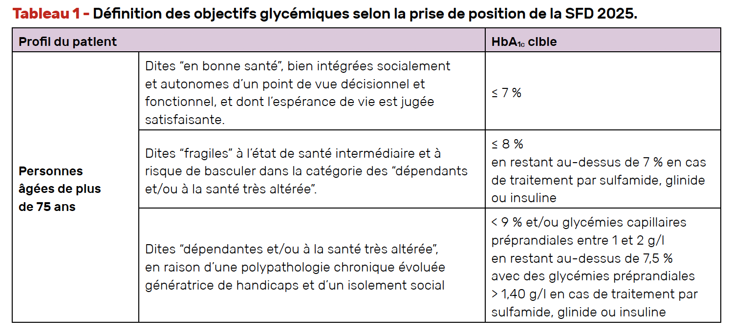 La dernière prise de position de la SFD publiée à la fin de l’année 2025 consacre un chapitre important aux objectifs glycémiques fondés sur le niveau de l’HbA1c et adaptés à la présentation clinique de la personne (Tab. 1) (6).