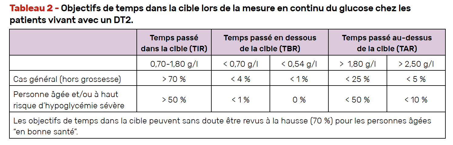 La mesure en continu du glucose (CGM) a pour intérêt de préciser les objectifs glycémiques et de mettre en évidence des épisodes d’hypoglycémies qui resteraient méconnus. Chez les personnes âgées fragiles, ces objectifs sont moins ambitieux que chez les personnes plus jeunes et visent à prévenir les hypoglycémies sévères notamment nocturnes (Tab. 2) (7). Malheureusement, dans les Ehpad, la prise en charge des dispositifs médicaux et donc du CGM entre dans le cadre du forfait soin qui est relativement faible (environ 3 € par jour et par patient), si bien que certains établissements refusent de financer l’achat des capteurs pour les malades qui en auraient pourtant besoin.