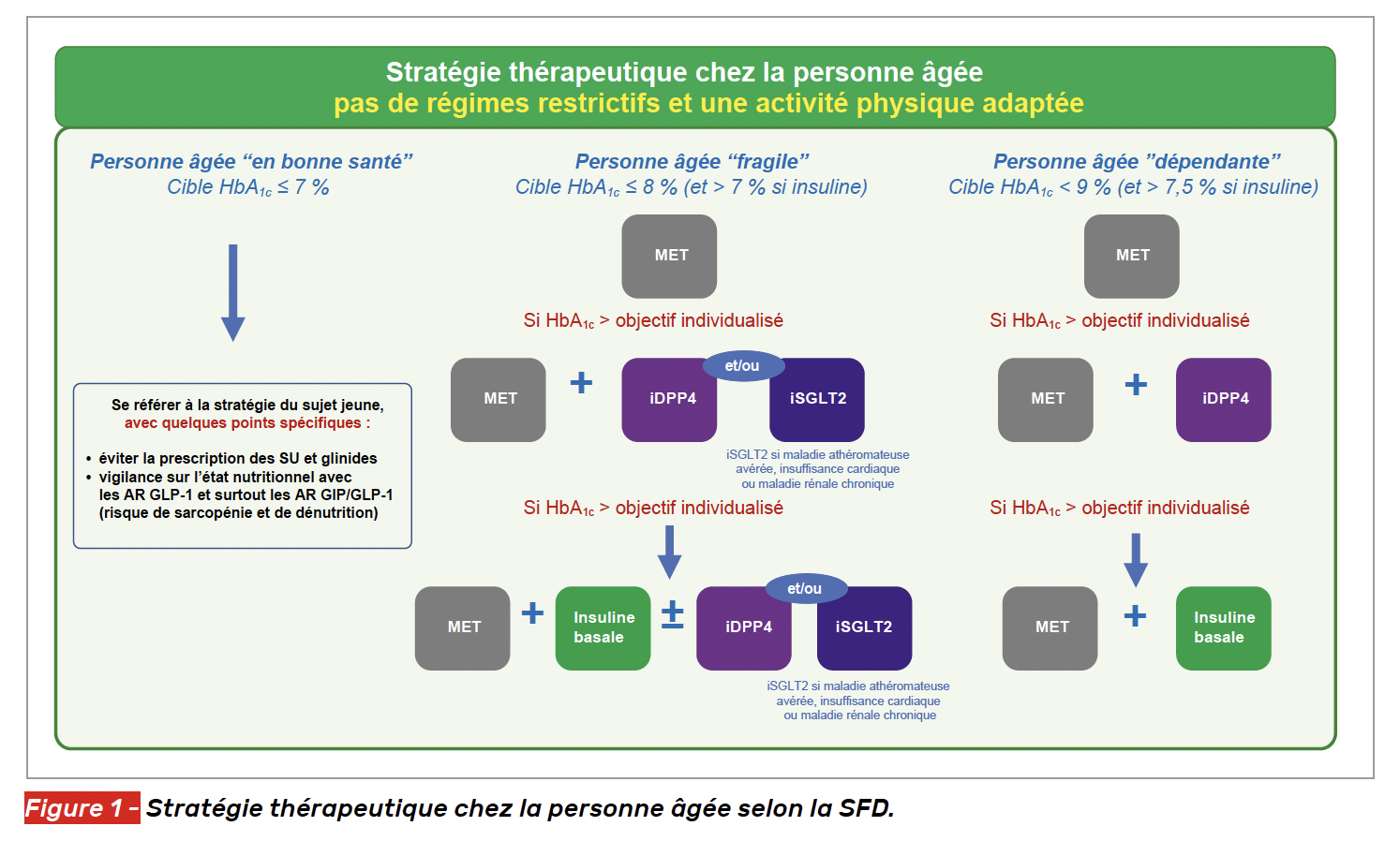 La stratégie thérapeutique de la prise en charge de l’hyperglycémie chez les sujets âgés a été précisée dans les dernières recommandations de la SFD, qui prennent particulièrement en compte la présentation clinique des malades (Fig. 1) (6).