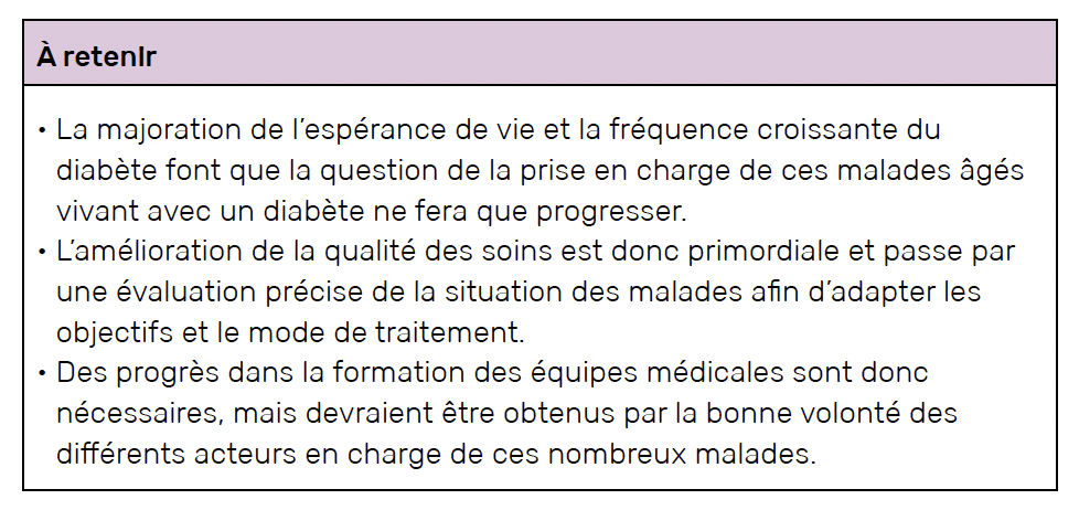 La prise en charge du diabète des personnes âgées est d’une grande actualité en raison de l’augmentation conjointe de la prévalence de la maladie et de l’espérance de vie. C’est ainsi qu’à ce jour un patient diabétique sur quatre est âgé de plus de 75 ans. La plupart de ces malades présente un diabète de type 2, mais aujourd’hui beaucoup de personnes atteignent un âge avancé en dépit de leur diabète de type 1. L’amélioration de la qualité des soins chez ces nombreuses personnes diabétiques est donc une priorité afin d’éviter les complications et de majorer leur espérance de vie en bonne santé. Afin de parvenir à ces objectifs, il est nécessaire d’observer une conduite précise et coordonnée pour adapter leur prise en charge.