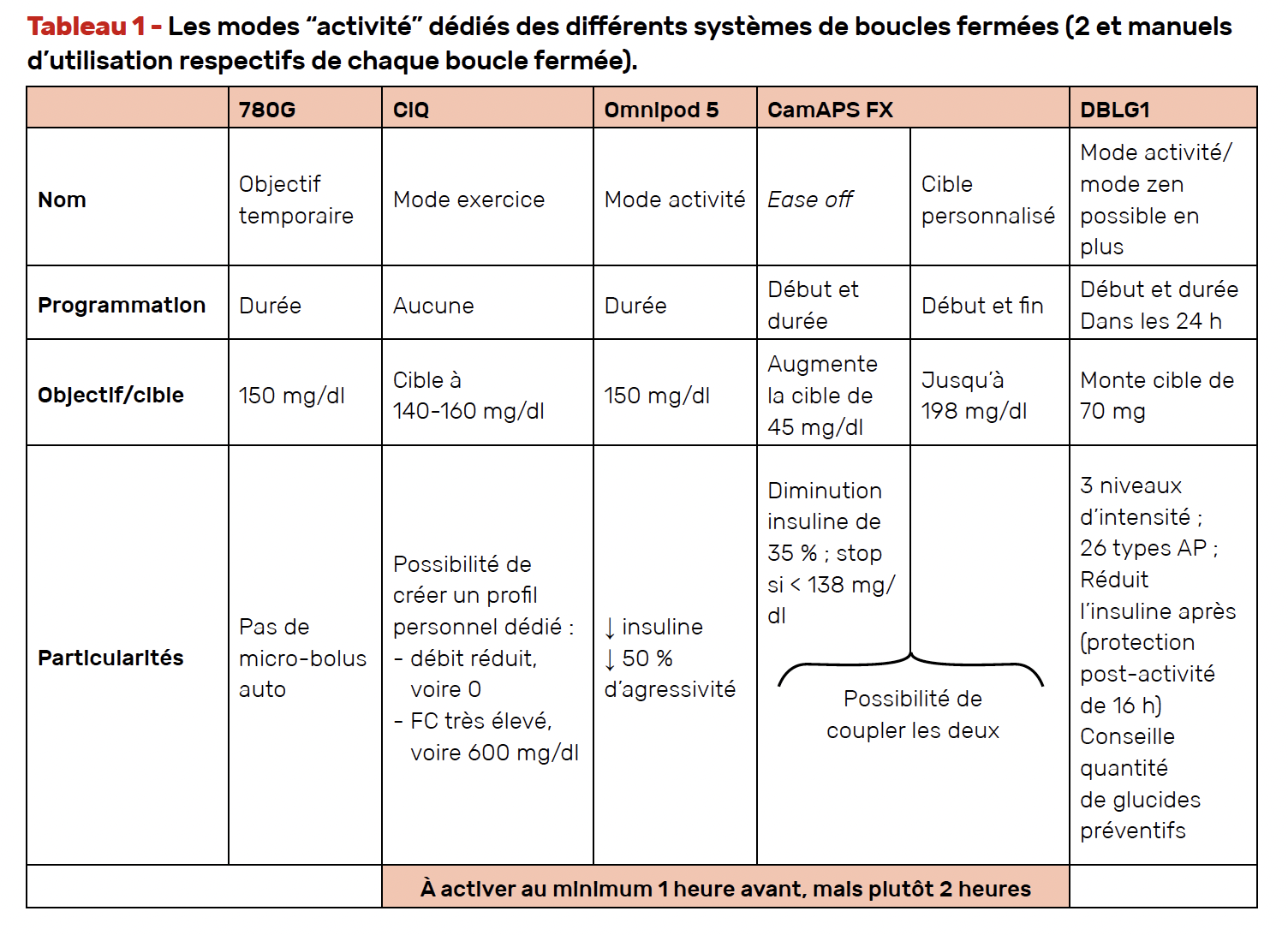 • Diabeloop DBLG1® : le système permet une augmentation de 70 mg/dl de la cible de glycémie, réduit l’insuline dans les 16 heures suivant la pratique de l’activité et conseille sur des quantités de glucides en préventif ; trois niveaux d’intensité peuvent être précisés par l’utilisateur et 26 types d’activité physique.