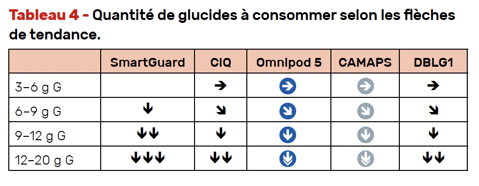Si la glycémie chute en dessous de 1,25 g/l une petite quantité de glucides (de 3 à 20 g) en fonction des flèches de tendance :