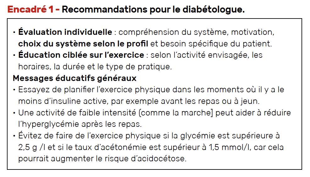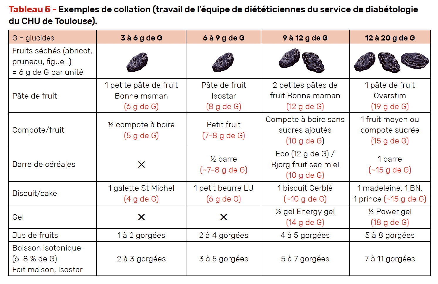 Dans tous les cas, pendant l’activité physique il est recommandé de surveiller la glycémie et de consommer des collations glucidiques si besoin (Tab. 4 et 5).